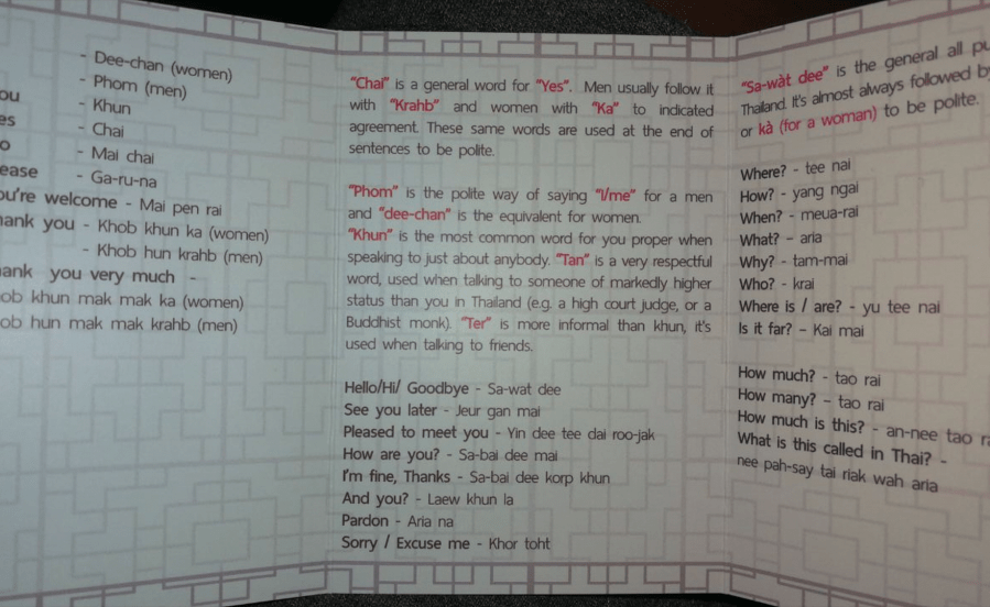 This little pocket book of Thai basics from a hotel in Bangkok came in very handy.