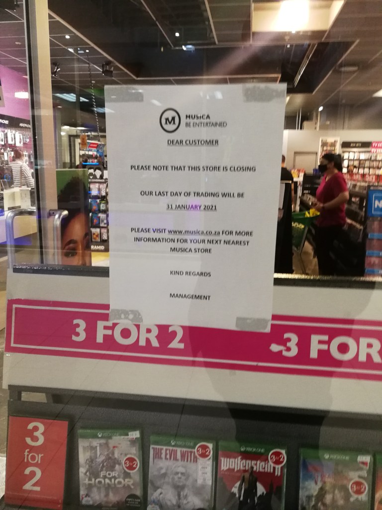 The article on Timeslive (https://www.timeslive.co.za/news/south-africa/2021-01-29-end-of-an-era-sa-reminisces-about-musica-as-popular-chain-closes-down/ brings me somewhat hope, for now at least. It says that 19 stores countrywide will close since the start of the 2021 financial year and that 59 others will continue trading until imminent closure in the next couple of months.