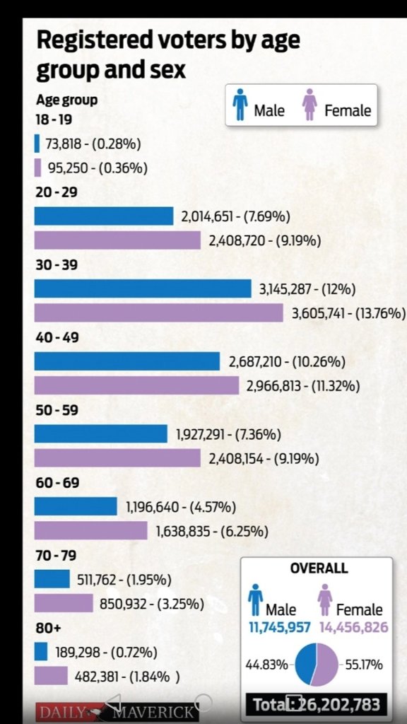 We are constantly bombarded with calls to change the status quo, but how will this be the case when the right to vote is left only to others – when on voting day, many young people will go about their normal lives and treat it as yet another ‘holiday’. Reported figures reveal that only 17.52% of young people between 18 and 29 years of age are on the voter’s roll (see voter’s roll image to follow). This means the majority (82.47%) will be determined by people aged from 30 upwards.