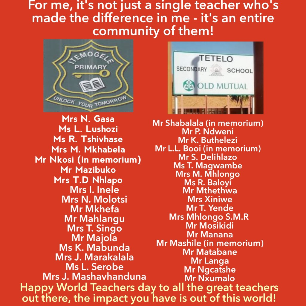 So, I went back, from my Grade 1 teacher (Mrs N. Gasa, the woman who first taught me how to read and write) and worked my way up from there to sort of attempt to put a name to the impact as experienced from one point to the next in my schooling career. I know there are many other teachers who may not be on the list per se, and I sincerely apologize for that but a point I am attempting to drive home here is that it’s not just one teacher, but an entire community of people, who happened to be my teachers, that made an impact on me.